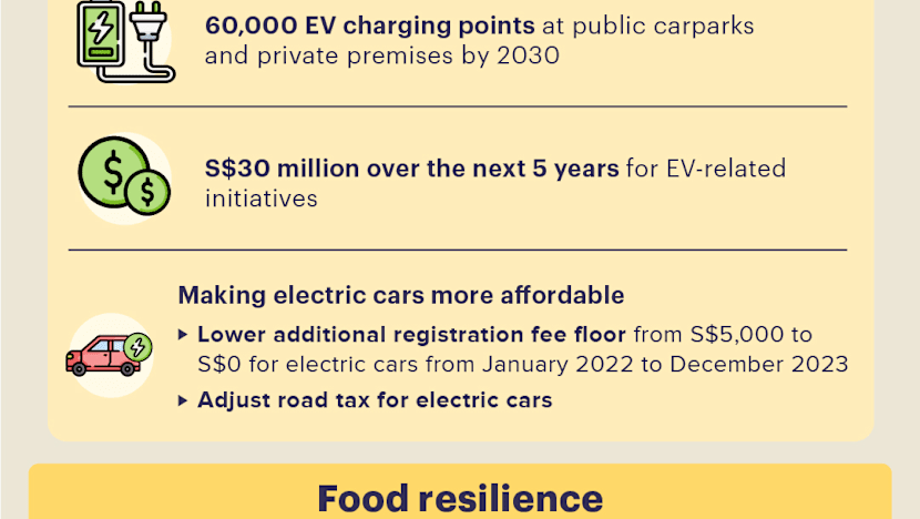 They include lowering the Additional Registration Fee floor for electric cars to zero between January 2022 to December 2023, and adjusting the road tax for electric cars so that owners of these cars can pay road tax that is comparable to those with internal combustion engine (ICE) cars.