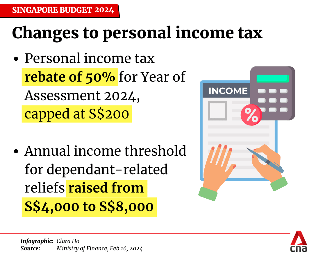 A personal income tax rebate of 50 per cent will apply in the year of assessment 2024. This will be capped at S$200 to mainly benefit middle-income workers, said Mr Wong.