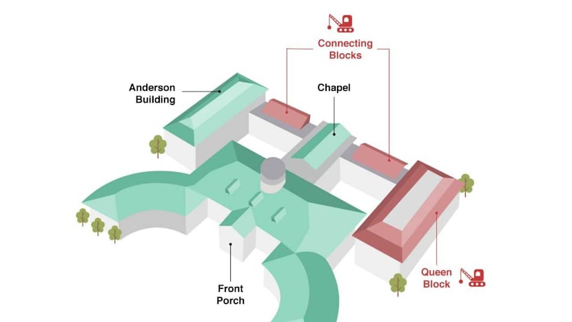 Only the "connecting blocks" and the Queen Block, built in the 1990s, are being demolished, said the Singapore Art Museum. Illustration: Anam Musta'ein/TODAY