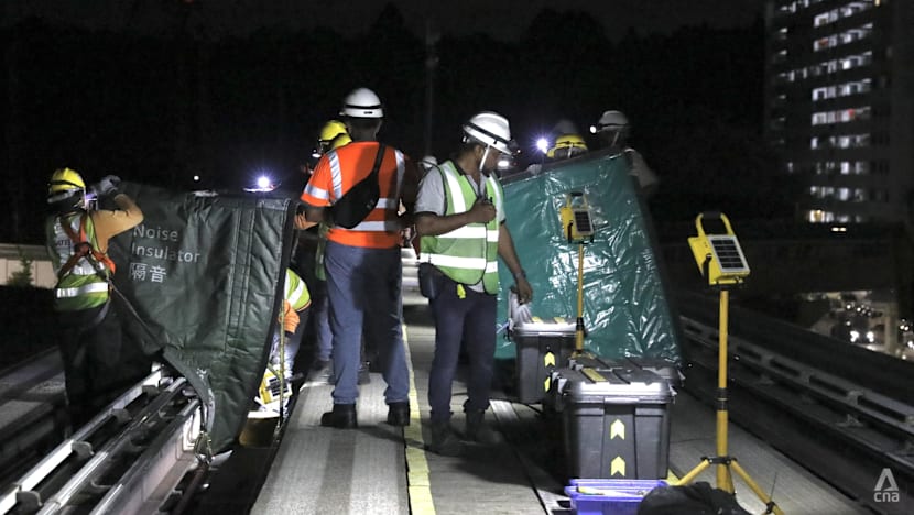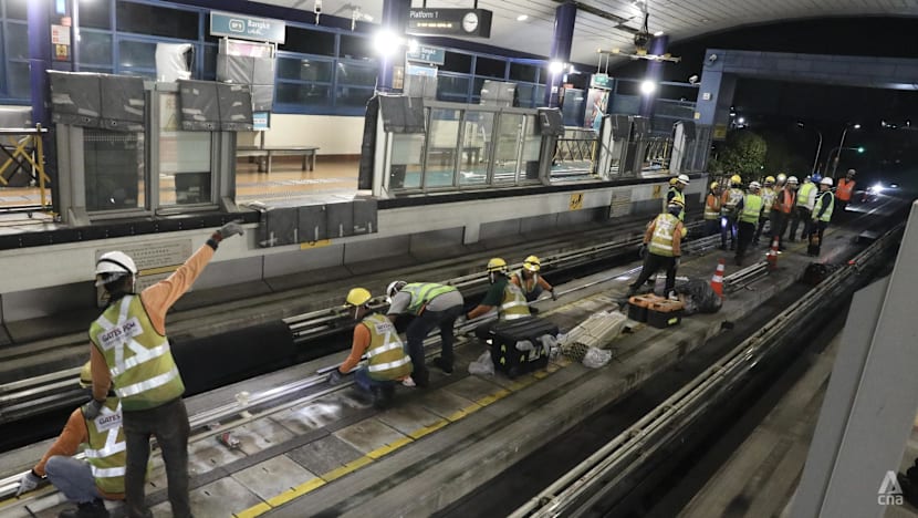 Workers carrying out power rail replacement works on the Bukit Panjang LRT tracks on Nov 15, 2025. (Photo: CNA/Mak Jia Kee)