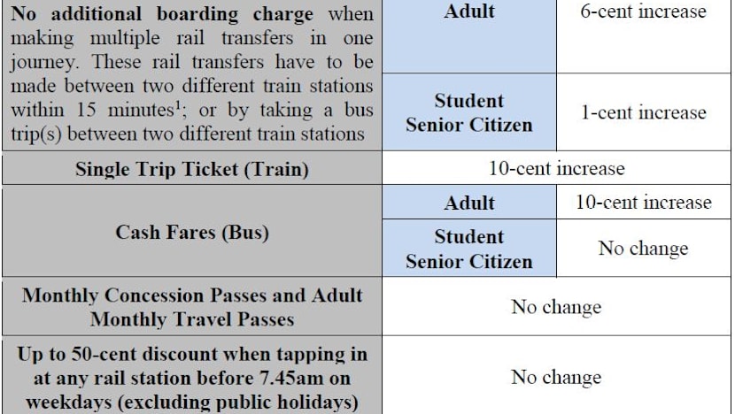 From Dec 29, adults taking train and buses will have to pay 6 cents more for card fares, and single trips on both modes of transport will cost 10 cents more. Students and senior citizens, on the other hand, will pay up to 1 cent more in card fares.