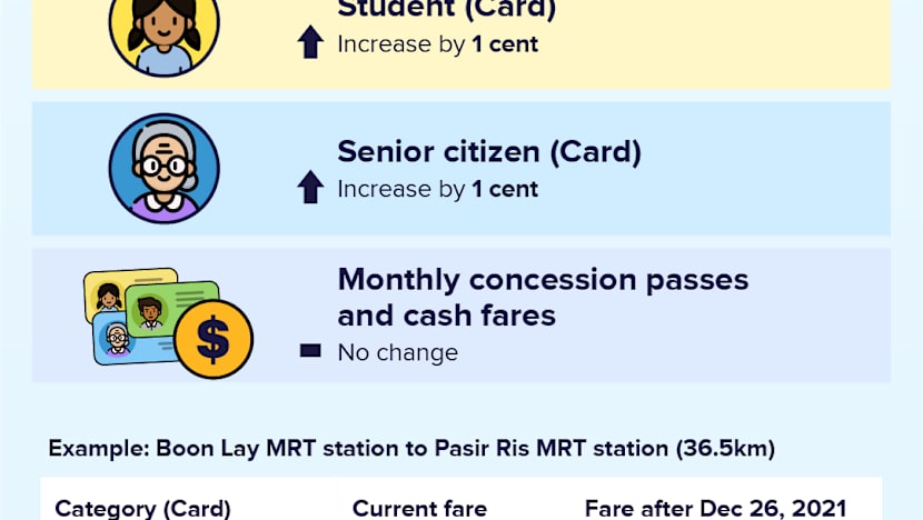 - Concession fares for students, seniors, persons with disabilities and lower wage workers to go up by 1 cent per journey