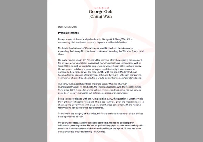 SINGAPORE — Singapore businessman George Goh announced on Monday (June 12) that he will be contesting the upcoming Presidential Election.