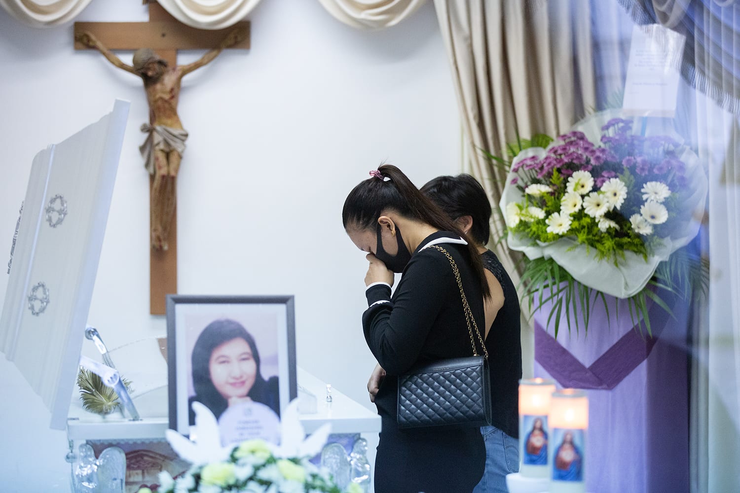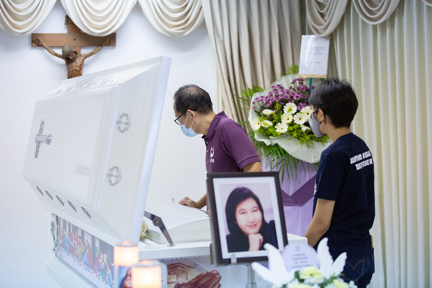 Family and visitors praying at the funeral wake of Home's founder Bridget Tan on April 22, 2022.