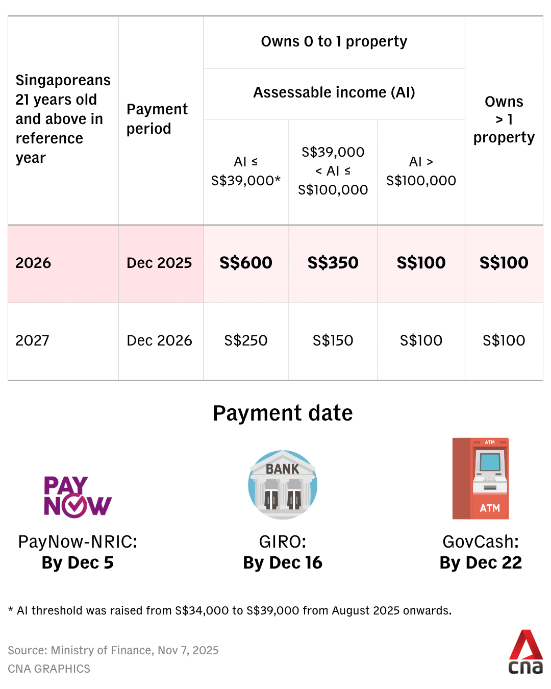 SINGAPORE: Singaporeans aged 21 and above in 2026 will receive cash payments of between S$100 (US$77) and S$600 from Dec 5, 2025.