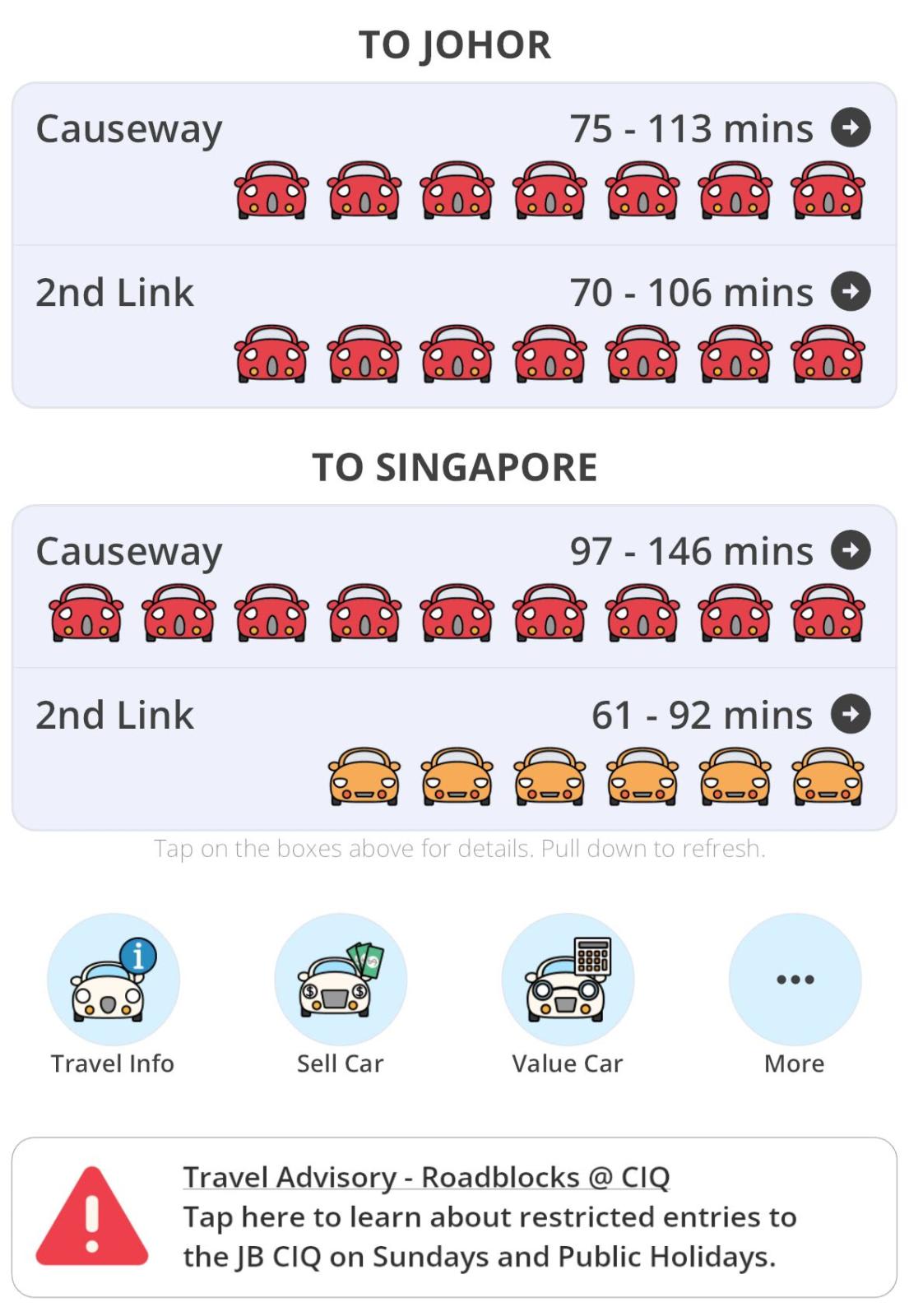 If you’re driving, popular apps such as Beat the Jam and Checkpoint.sg provide insight into the current traffic situation, with snapshots from road cameras on both sides and estimated travel times.
