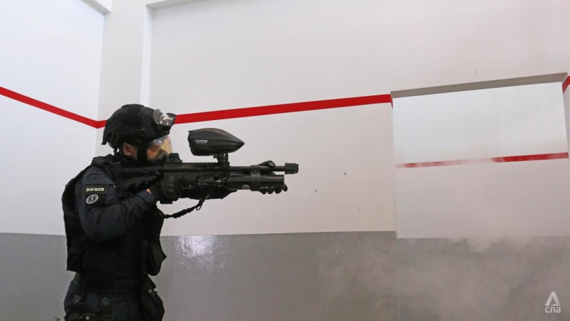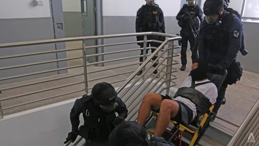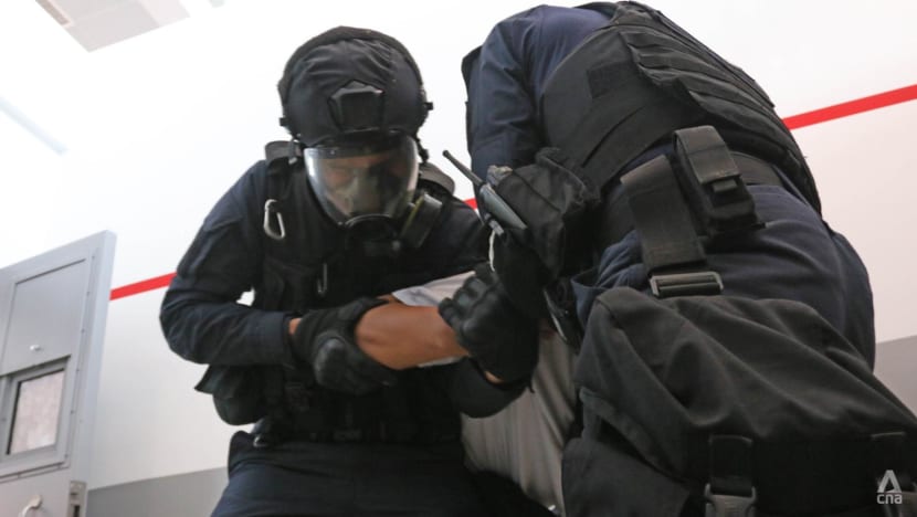 This was part of a demonstration put up by the unit at its base in Changi Prison on Tuesday (Feb 8) to showcase the technology used in handling violent inmates.