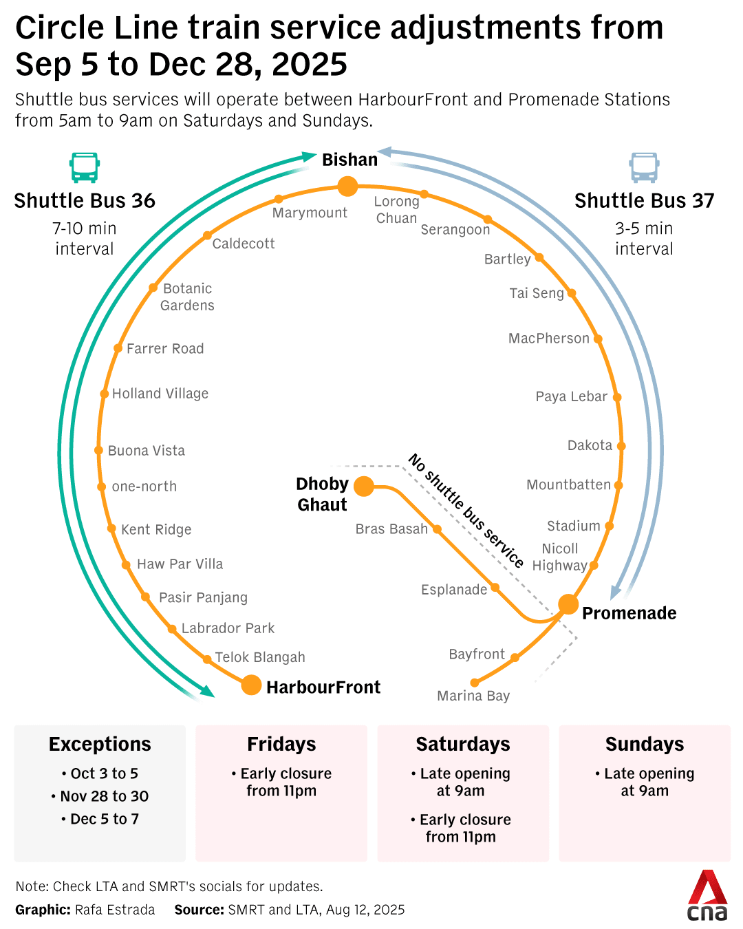 Circle Line train services to end early and start later on selected days from Sep 5 to Dec 28