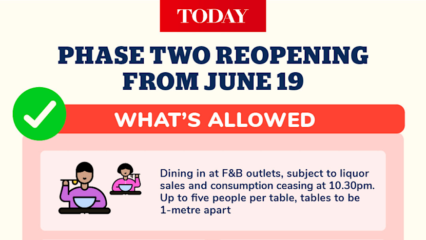 SINGAPORE — Dining in at restaurants, tuition classes and exercising at sports facilities and gyms are among several activities that will be allowed to resume from this Friday (June 19), with certain limits, as Singapore moves into the second phase of its circuit breaker exit.