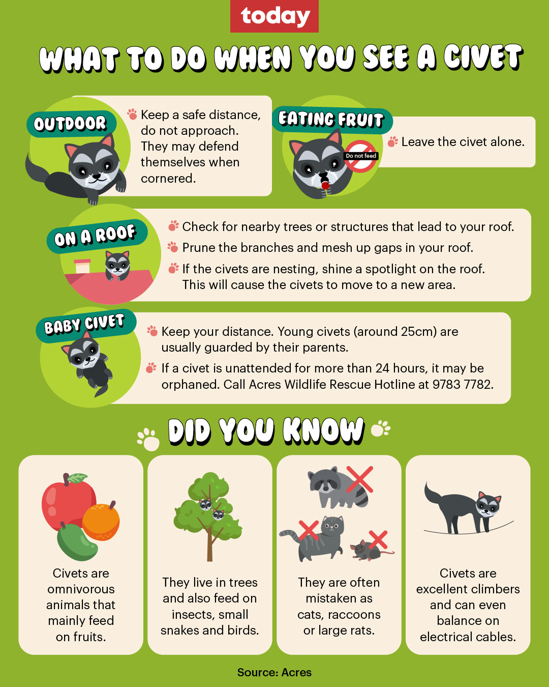 The Animal Concerns Research and Education Society (Acres) told TODAY that it received more than double the number of reports of civets in the last year, up to 15 to 20 reports every month, from six to nine per month previously in 2021.