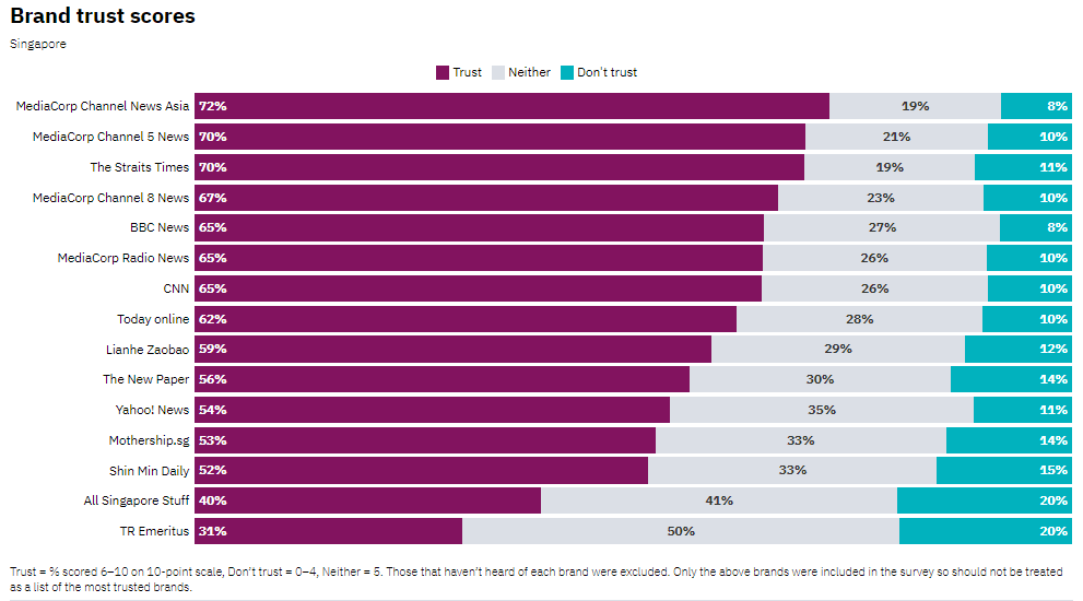 In all, Mediacorp has five news brands in the top 10 ranking on trust, including Mediacorp Radio News in sixth position and TODAY Online in eighth place.