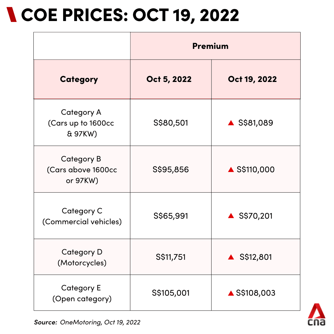 SINGAPORE: Certificate of Entitlement (COE) premiums for motorcycles rose to another new high on Wednesday (Oct 19), while prices in other categories also closed higher in the latest bidding exercise.