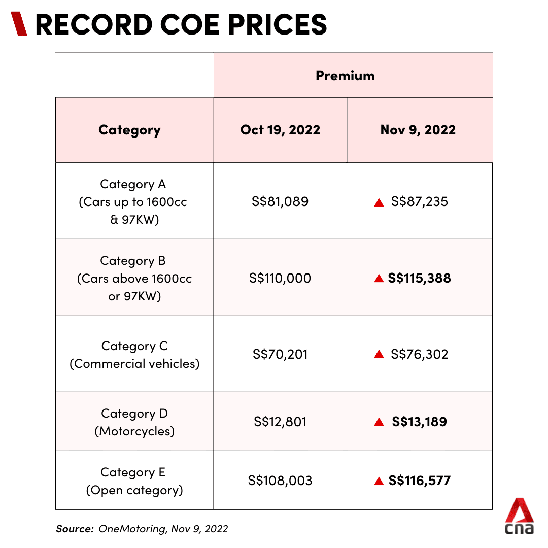 SINGAPORE: Certificate of Entitlement (COE) premiums on Wednesday (Nov 9) hit new records across three categories, including for larger cars and motorcycles.