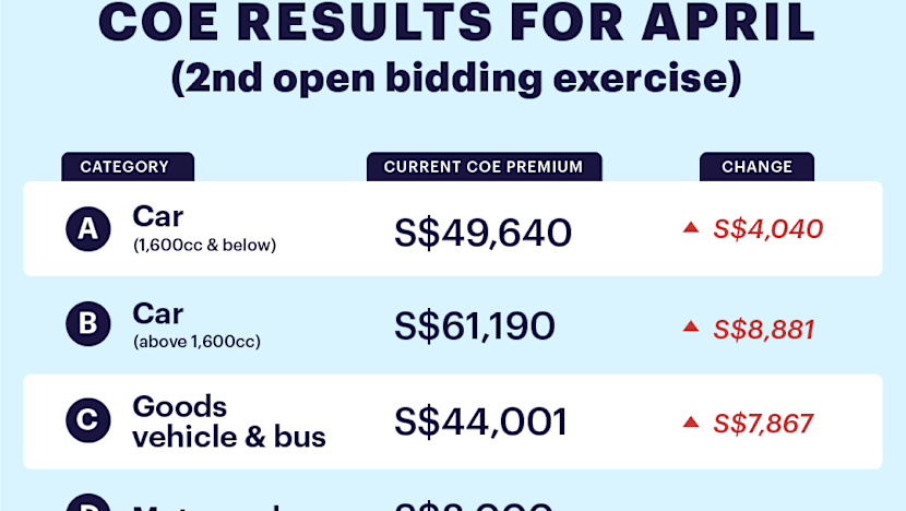 At the end of the latest bidding exercise on Wednesday (April 21), premiums for small cars (up to 1,600cc and with horse power of up to 97kW) went up from S$45,600 to close at S$49,640. This was an 8.86 per cent jump.