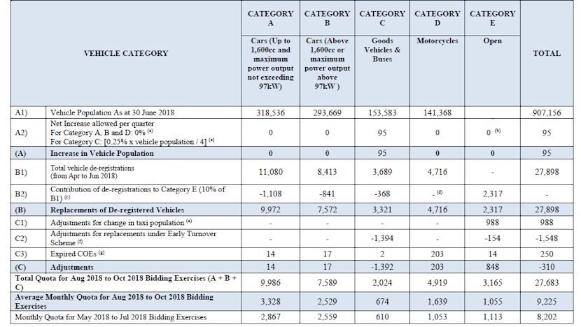 Among other things, the quota consists of replacement COEs from vehicles deregistered between April and June 2018. A total of 27,898 vehicles were deregistered during that period, including 11,080 small cars and 8,413 bigger cars.