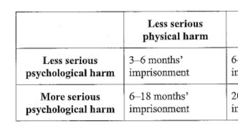 If the abuse was mainly physical, the court should consider the degree of harm, as well as the aggravating and mitigating factors, in deciding on the appropriate sentence. If the abuse was both physical and psychological, the court then needs to identify the degree of harm caused in relation to each charge.