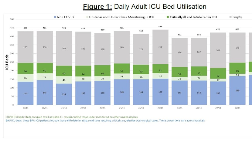 - There are 422 ICU beds, of which 238 are now occupied, including 69 by Covid-19 patients