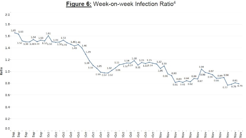 This is the 10th day in a row that the week-on-week infection ratio rate has been below 1.0.