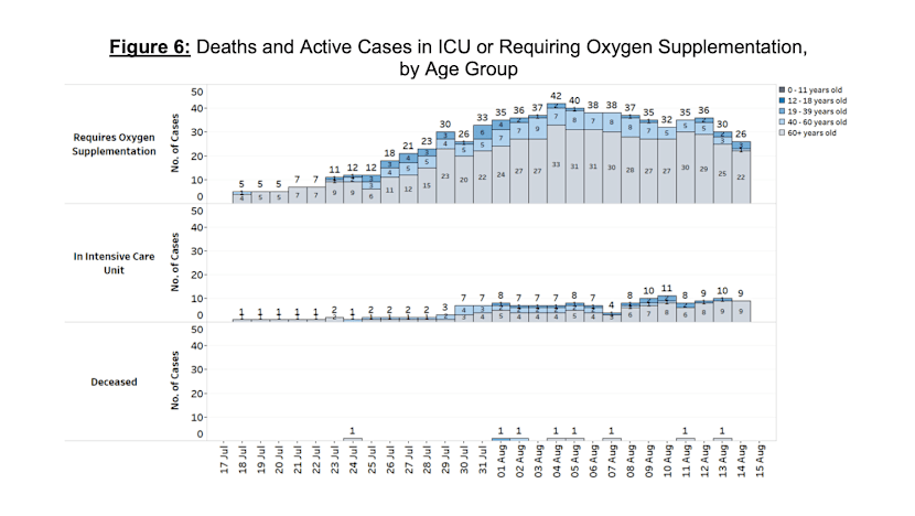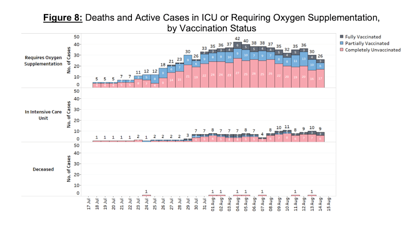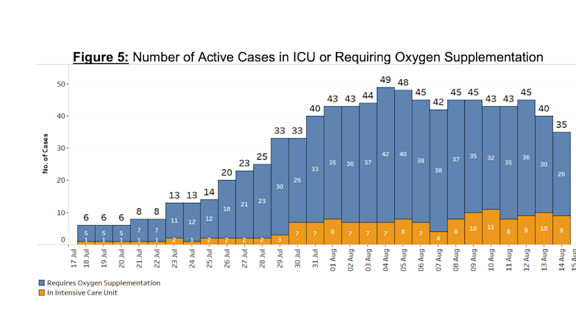 Among the nine patients in intensive care and the 26 with serious illness, six are fully vaccinated.