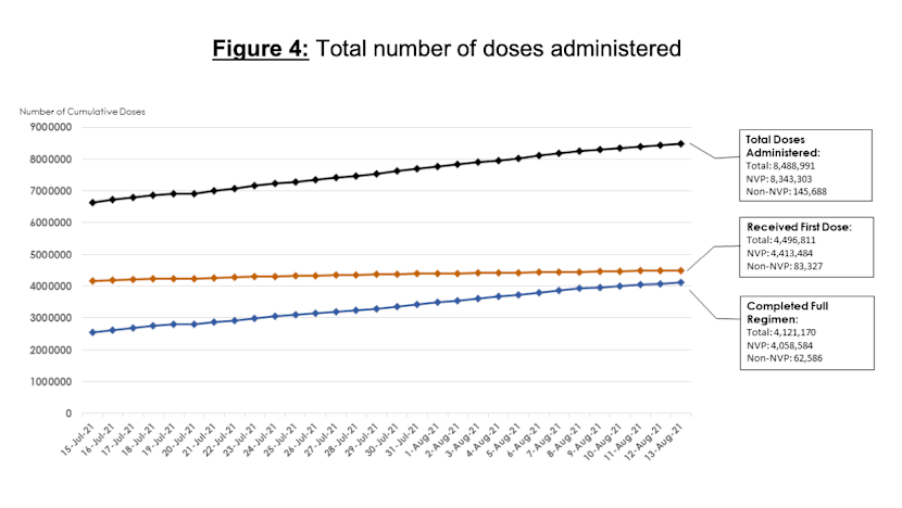 In all, more than 8.34 million doses of the Pfizer-BioNTech/Comirnaty and Moderna vaccines had been administered to 4.41 million people, with nearly 4.06 million having completed their full regimen.