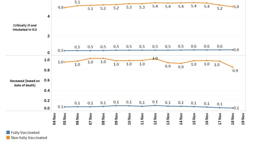 - The number of fully vaccinated patients who were critically ill in ICU was at 0.6 per 100,000 people and for non-fully vaccinated patients, it was 5.0
