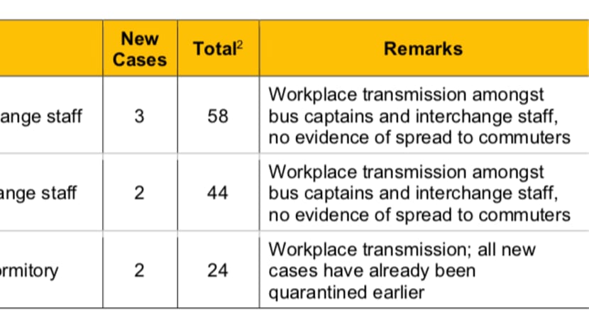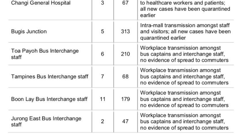 For the bus interchanges at Boon Lay, Clementi, Jurong East, Punggol, Tampines and Toa Payoh, 31 new cases were recorded, bringing the total for the bus interchange cluster to 606 cases.