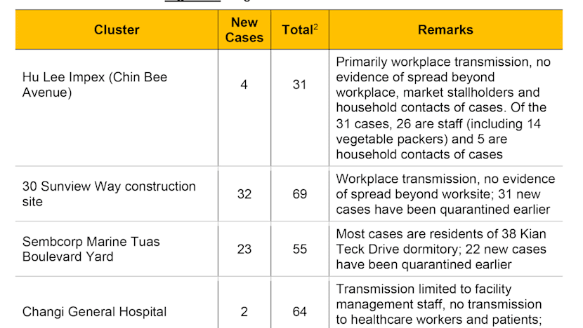 Among the clusters, Hu Lee Impex, which is located on Chin Bee Avenue near Boon Lay, saw four new cases on Friday, bringing the tally to 31.