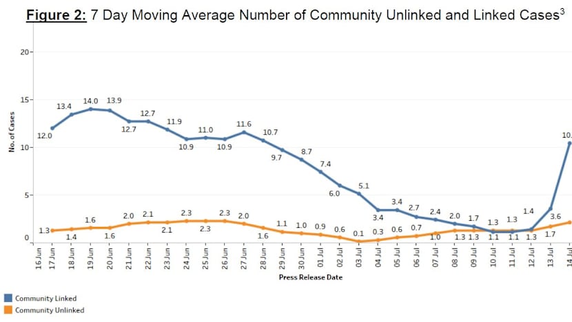 Data from the ministry showed that the seven-day moving average number of community linked cases has jumped from 3.6 on Tuesday to 10.4 on Wednesday.