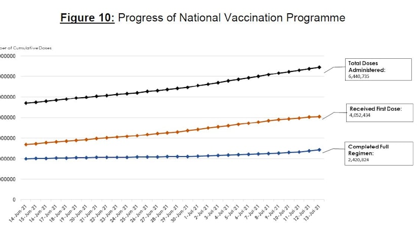 Some 2.42 million people have completed the full vaccination regimen, consisting of 32,523 recovered persons who received at least one dose and close to 2.39 million who received their second dose.