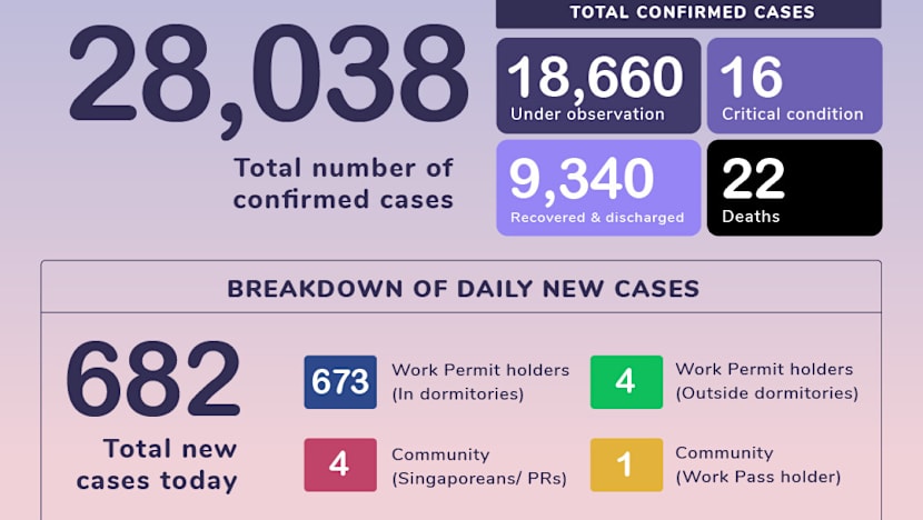 Of the 682 new infections, five were cases in the wider community. Of these, four are Singaporeans or permanent residents and one is a work pass holder.