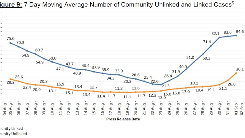 The seven-day moving average number of all linked community cases and all unlinked community cases is 84.6 and 36.1 respectively.