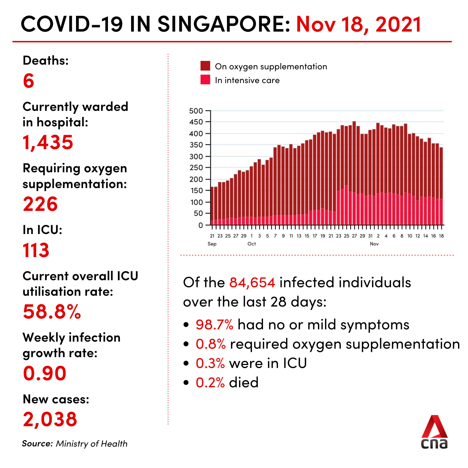 SINGAPORE: Singapore reported 2,038 new COVID-19 cases as of noon on Thursday (Nov 18), as the daily number of coronavirus-related deaths fell to its lowest in more than three weeks.