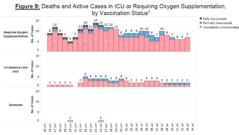 “Over the last 28 days, 22 local cases required oxygen supplementation, were admitted to intensive care units or died. Eighteen are unvaccinated, four are partially vaccinated and none are fully vaccinated.”