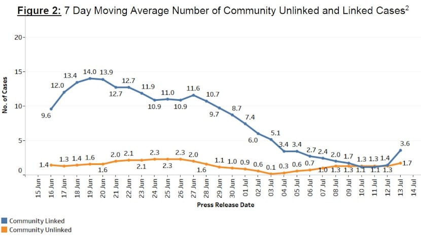 Data from MOH showed that the seven-day moving average number of community linked cases has jumped from 1.4 on Monday to 3.6 on Tuesday.