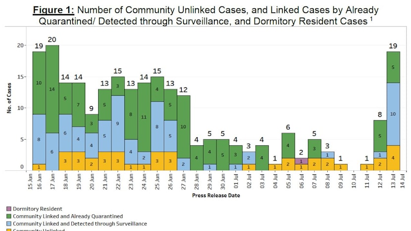 SINGAPORE — Singapore on Tuesday (July 13) recorded 19 new locally transmitted cases of Covid-19, eight of which have been traced to an emerging cluster at karaoke lounges and clubs that are now operating as food-and-beverage (F&B) outlets. The cluster now has 12 cases.