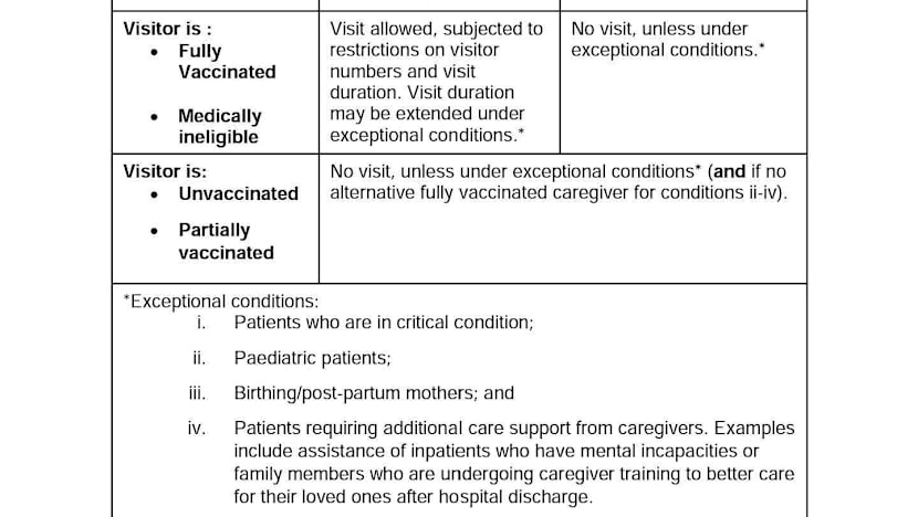 If the patient or resident or visitor, or all, are not fully vaccinated, visits will only be allowed under exceptional circumstances on a case-by-case basis, as advised by the hospitals and care homes.