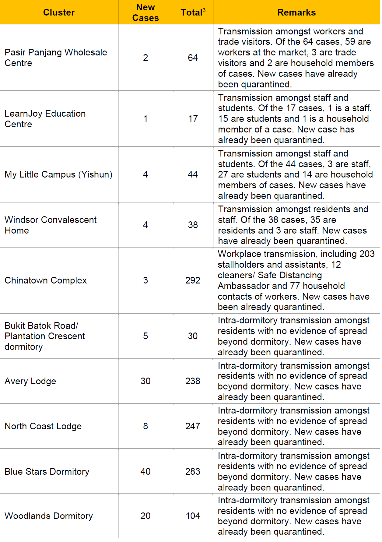 Several of the existing dormitory clusters reported new infections. The cluster at Blue Stars Dormitory grew to 283, after 40 new cases were added. Twenty more cases were also linked to the Woodlands Dormitory cluster, which now has 104 cases.