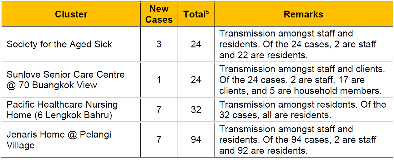 This includes the cluster at Jenaris Home @ Pelangi Village, which reported seven new cases to expand its total to 94. Of these cases, two are staff members and 92 are residents.
