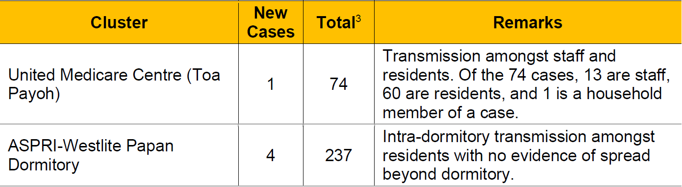 MOH said it is "closely monitoring" two active clusters, United Medicare Centre (Toa Payoh) and ASPRI-Westlite Papan Dormitory which added one and four new cases respectively.