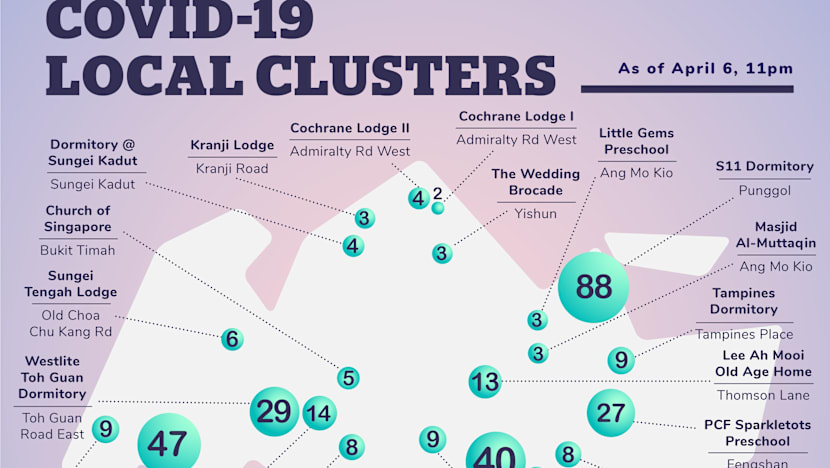 There are now 28 local clusters of infection in Singapore: Wizlearn Technologies at Science Park, Safra Jurong, Church of Singapore in Bukit Timah, Boulder+ gym at Aperia Mall in Kallang, Masjid Al-Muttaqin in Ang Mo Kio, PCF Sparkletots preschool @Fengshan Blk 126, Dover Court International School, Singpost Centre, The Wedding Brocade bridal salon in Yishun, S11 Dormitory in Punggol, Wilby Residences, Hero's at Circular Road, Westlite Toh Guan dormitory at Toh Guan Road East, Lee Ah Mooi Old Age Home at Thomson Lane, a dormitory located at 55 Sungei Kadut Loop, Mustafa Centre, a construction site at Maxwell MRT, Keppel Shipyard, nightclub Ce La Vi located in Marina Bay Sands, Singapore Cricket Club, the construction site at Project Glory at Market Street, Sungei Tengah Lodge, Toh Guan Dormitory, Cochrane Lodge II, The Orange Ballroom along Geylang Road, Tampines Dormitory, Cochrane Lodge I, a construction site at 6 Battery Road, Little Gems preschool in Ang Mo Kio and Kranji Lodge along Kranji Road.