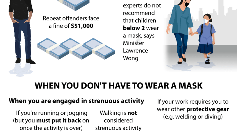SINGAPORE: Anyone caught not wearing a mask when they leave their residence from Wednesday (Apr 15) faces a fine of S$300 for the first offence and S$1,000 if they do it again.
