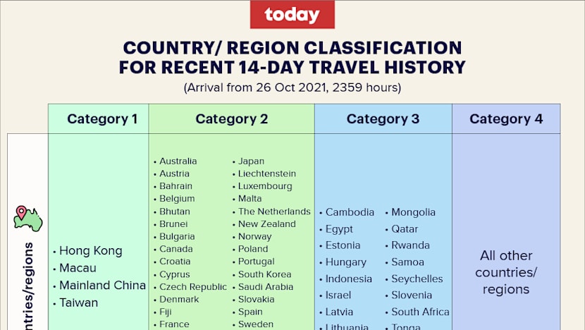 The authorities will also place the following regions under Category III from 11.59pm on Oct 26: Cambodia, Egypt, Hungary, Indonesia, Israel, Malaysia, Mongolia, Qatar, Rwanda, Samoa, Seychelles, South Africa, Tonga, the United Arab Emirates and Vietnam.