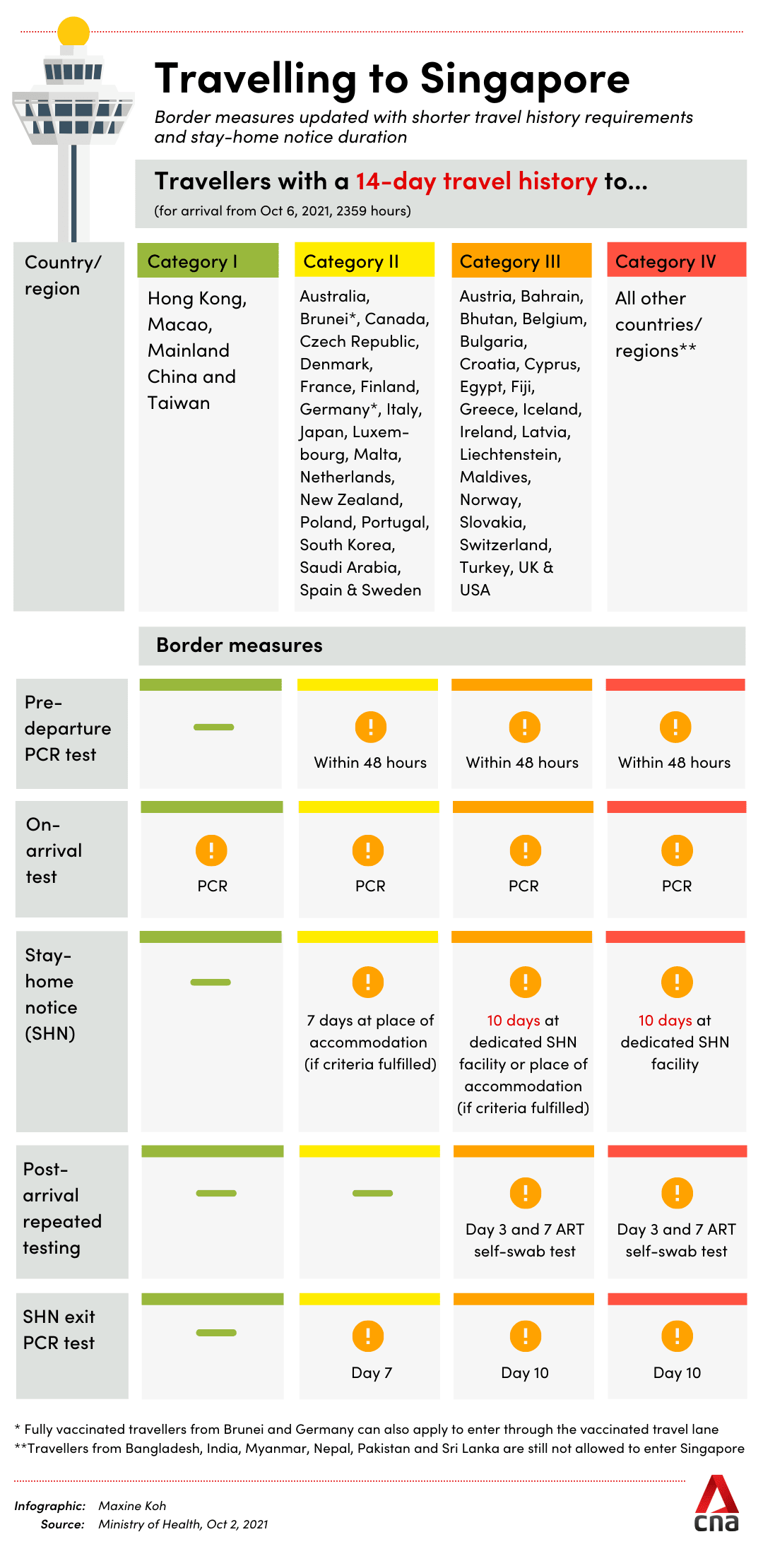 The new stay-home notice period, which applies to those who are coming from Category III and IV regions, will kick in from 11.59pm on Oct 6.