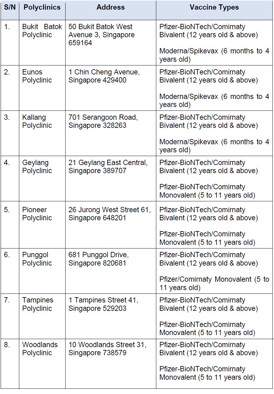 All eight polyclinics will offer the Pfizer-BioNTech/Comirnaty vaccine for eligible individuals aged 12 and above. Selected clinics will offer the Pfizer-BioNTech vaccine for those aged five to 11, or the Moderna/Spikevax vaccine for those aged six months to 4 years old.
