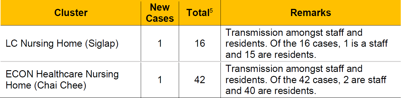 One new case was added to LC Nursing Home (Siglap) and ECON Healthcare Nursing Home (Chai Chee) each. This brings the total number of cases at LC Nursing Home and ECON Healthcare Nursing Home to 16 and 42 respectively.