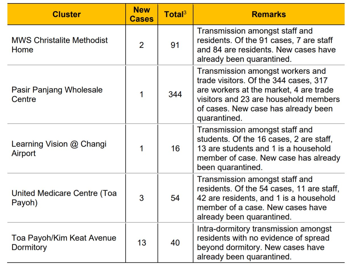 One new case was added to the clusters at Pasir Panjang Wholesale Centre and Learning Vision @ Changi Airport.