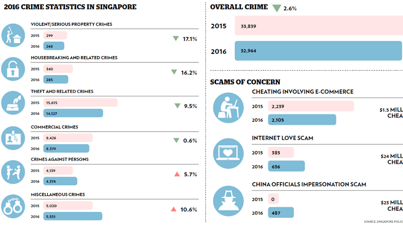 The Chinese officials impersonation scam was a new development last year, with no such case reported in 2015. Such scams see the perpetrator pose as a Chinese official who call victims claiming that they are wanted by the authorities for illegal activities. The victims were asked to remit money to “clear their name”.