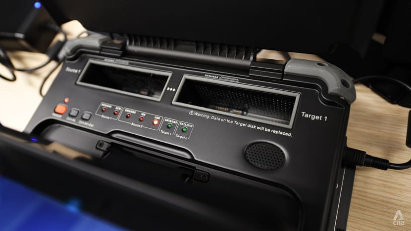 CSA senior consultant Adam Ho connects a hard disk drive to the forensic cloner. (Photo: CNA/Calvin Oh)