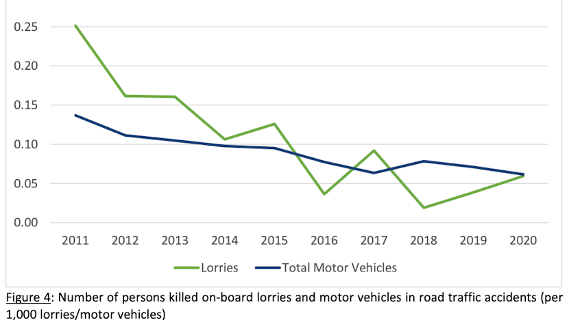 However, some figures and charts provided by LTA indicated that the total number of deaths involving lorry accidents, and the number of deaths per 1,000 lorries on the road, have been rising in the past couple of years.