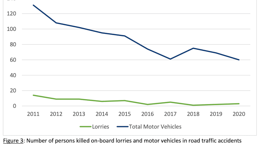 The fatality rate for people on board lorries was nine a year on average from 2011 to 2015, and fell to 2.6 on average per year from 2016 to 2020.